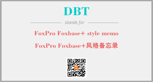 英文缩略词“DBT”经常作为“FoxPro Foxbase+ style memo”的英文缩写来使用,中文表示:“FoxPro Foxbase+风格备忘录”。本文将详细介绍英文缩写词DBT所代表英文单词,其对应的中文拼音、详细解释以及在英语中的流行度。此外,还有关于缩略词DBT的分类、应用领域及相关应用示例等。