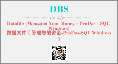 上述内容是“Datafile (Managing Your Money - ProDas - SQL Windows)”作为“DBS”的缩写,解释为“数据文件(管理您的资金-ProDas-SQL Windows)”时的信息,以及英文缩略词DBS所代表的英文单词,其对应的中文拼音、详细解释以及在英文中的流行度和相关分类、应用领域及应用示例等。