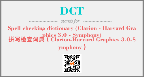 英文缩略词“DCT”经常作为“Spell checking dictionary (Clarion - Harvard Graphics 3.0 - Symphony)”的英文缩写来使用,中文表示:“拼写检查词典(Clarion-Harvard Graphics 3.0-Symphony)”。本文将详细介绍英文缩写词DCT所代表英文单词,其对应的中文拼音、详细解释以及在英语中的流行度。此外,还有关于缩略词DCT的分类、应用领域及相关应用示例等。