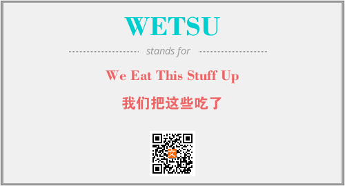 上述内容是“We Eat This Stuff Up”作为“WETSU”的缩写,解释为“我们把这些吃了”时的信息,以及英文缩略词WETSU所代表的英文单词,其对应的中文拼音、详细解释以及在英文中的流行度和相关分类、应用领域及应用示例等。