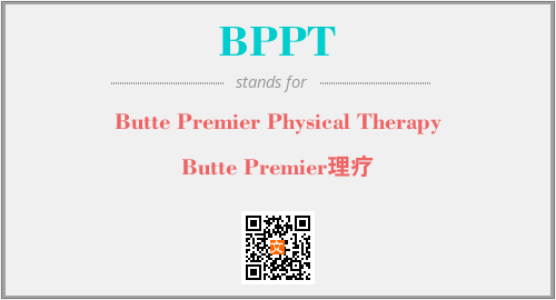 上述内容是“Butte Premier Physical Therapy”作为“BPPT”的缩写,解释为“Butte Premier理疗”时的信息,以及英文缩略词BPPT所代表的英文单词,其对应的中文拼音、详细解释以及在英文中的流行度和相关分类、应用领域及应用示例等。