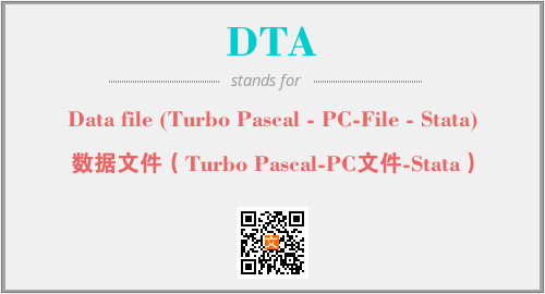 英文缩略词“DTA”经常作为“Data file (Turbo Pascal - PC-File - Stata)”的英文缩写来使用,中文表示:“数据文件(Turbo Pascal-PC文件-Stata)”。本文将详细介绍英文缩写词DTA所代表英文单词,其对应的中文拼音、详细解释以及在英语中的流行度。此外,还有关于缩略词DTA的分类、应用领域及相关应用示例等。