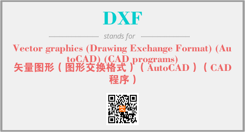 上述内容是“Vector graphics (Drawing Exchange Format) (AutoCAD) (CAD programs)”作为“DXF”的缩写,解释为“矢量图形(图形交换格式)(AutoCAD)(CAD程序)”时的信息,以及英文缩略词DXF所代表的英文单词,其对应的中文拼音、详细解释以及在英文中的流行度和相关分类、应用领域及应用示例等。