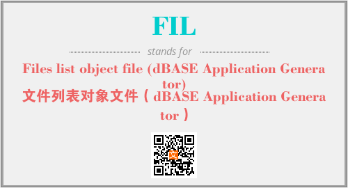 英文缩略词“FIL”经常作为“Files list object file (dBASE Application Generator)”的英文缩写来使用,中文表示:“文件列表对象文件(dBASE Application Generator)”。本文将详细介绍英文缩写词FIL所代表英文单词,其对应的中文拼音、详细解释以及在英语中的流行度。此外,还有关于缩略词FIL的分类、应用领域及相关应用示例等。