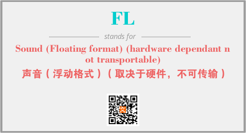 英文缩略词“FL”经常作为“Sound (Floating format) (hardware dependant not transportable)”的英文缩写来使用,中文表示:“声音(浮动格式)(取决于硬件,不可传输)”。本文将详细介绍英文缩写词FL所代表英文单词,其对应的中文拼音、详细解释以及在英语中的流行度。此外,还有关于缩略词FL的分类、应用领域及相关应用示例等。