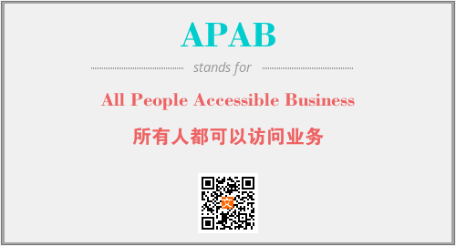 上述内容是“All People Accessible Business”作为“APAB”的缩写,解释为“所有人都可以访问业务”时的信息,以及英文缩略词APAB所代表的英文单词,其对应的中文拼音、详细解释以及在英文中的流行度和相关分类、应用领域及应用示例等。