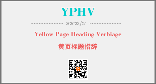 上述内容是“Yellow Page Heading Verbiage”作为“YPHV”的缩写,解释为“黄页标题措辞”时的信息,以及英文缩略词YPHV所代表的英文单词,其对应的中文拼音、详细解释以及在英文中的流行度和相关分类、应用领域及应用示例等。