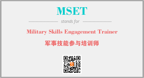 英文缩略词“MSET”经常作为“Military Skills Engagement Trainer”的英文缩写来使用,中文表示:“军事技能参与培训师”。本文将详细介绍英文缩写词MSET所代表英文单词,其对应的中文拼音、详细解释以及在英语中的流行度。此外,还有关于缩略词MSET的分类、应用领域及相关应用示例等。