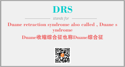 上述内容是“Duane retraction syndrome also called , Duane syndrome”作为“DRS”的缩写,解释为“Duane收缩综合征也称Duane综合征”时的信息,以及英文缩略词DRS所代表的英文单词,其对应的中文拼音、详细解释以及在英文中的流行度和相关分类、应用领域及应用示例等。