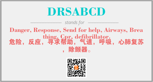 上述内容是“Danger, Response, Send for help, Airways, Breathing, Cpr, defibrillator.”作为“DRSABCD”的缩写,解释为“危险,反应,寻求帮助,气道,呼吸,心肺复苏,除颤器。”时的信息,以及英文缩略词DRSABCD所代表的英文单词,其对应的中文拼音、详细解释以及在英文中的流行度和相关分类、应用领域及应用示例等。