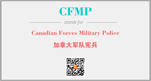 上述内容是“Canadian Forces Military Police”作为“CFMP”的缩写,解释为“加拿大军队宪兵”时的信息,以及英文缩略词CFMP所代表的英文单词,其对应的中文拼音、详细解释以及在英文中的流行度和相关分类、应用领域及应用示例等。