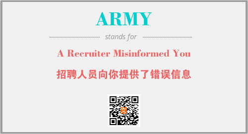 英文缩略词“ARMY”经常作为“A Recruiter Misinformed You”的英文缩写来使用,中文表示:“招聘人员向你提供了错误信息”。本文将详细介绍英文缩写词ARMY所代表英文单词,其对应的中文拼音、详细解释以及在英语中的流行度。此外,还有关于缩略词ARMY的分类、应用领域及相关应用示例等。