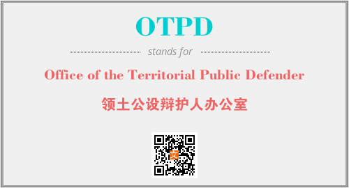 上述内容是“Office of the Territorial Public Defender”作为“OTPD”的缩写,解释为“领土公设辩护人办公室”时的信息,以及英文缩略词OTPD所代表的英文单词,其对应的中文拼音、详细解释以及在英文中的流行度和相关分类、应用领域及应用示例等。