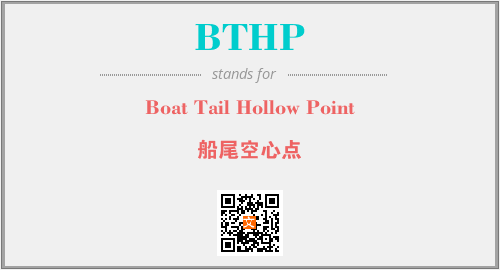 英文缩略词“BTHP”经常作为“Boat Tail Hollow Point”的英文缩写来使用,中文表示:“船尾空心点”。本文将详细介绍英文缩写词BTHP所代表英文单词,其对应的中文拼音、详细解释以及在英语中的流行度。此外,还有关于缩略词BTHP的分类、应用领域及相关应用示例等。