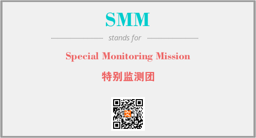 英文缩略词“SMM”经常作为“Special Monitoring Mission”的英文缩写来使用,中文表示:“特别监测团”。本文将详细介绍英文缩写词SMM所代表英文单词,其对应的中文拼音、详细解释以及在英语中的流行度。此外,还有关于缩略词SMM的分类、应用领域及相关应用示例等。