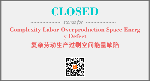上述内容是“Complexity Labor Overproduction Space Energy Defect”作为“CLOSED”的缩写,解释为“复杂劳动生产过剩空间能量缺陷”时的信息,以及英文缩略词CLOSED所代表的英文单词,其对应的中文拼音、详细解释以及在英文中的流行度和相关分类、应用领域及应用示例等。