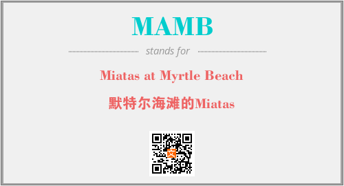英文缩略词“MAMB”经常作为“Miatas at Myrtle Beach”的英文缩写来使用,中文表示:“默特尔海滩的Miatas”。本文将详细介绍英文缩写词MAMB所代表英文单词,其对应的中文拼音、详细解释以及在英语中的流行度。此外,还有关于缩略词MAMB的分类、应用领域及相关应用示例等。