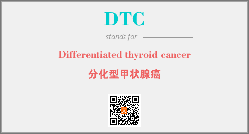 上述内容是“Differentiated thyroid cancer”作为“DTC”的缩写,解释为“分化型甲状腺癌”时的信息,以及英文缩略词DTC所代表的英文单词,其对应的中文拼音、详细解释以及在英文中的流行度和相关分类、应用领域及应用示例等。