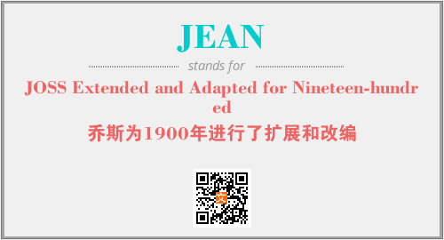 上述内容是“JOSS Extended and Adapted for Nineteen-hundred”作为“JEAN”的缩写,解释为“乔斯为1900年进行了扩展和改编”时的信息,以及英文缩略词JEAN所代表的英文单词,其对应的中文拼音、详细解释以及在英文中的流行度和相关分类、应用领域及应用示例等。