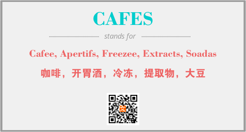 上述内容是“Cafee, Apertifs, Freezee, Extracts, Soadas”作为“CAFES”的缩写,解释为“咖啡,开胃酒,冷冻,提取物,大豆”时的信息,以及英文缩略词CAFES所代表的英文单词,其对应的中文拼音、详细解释以及在英文中的流行度和相关分类、应用领域及应用示例等。