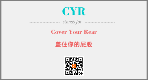 英文缩略词“CYR”经常作为“Cover Your Rear”的英文缩写来使用,中文表示:“盖住你的屁股”。本文将详细介绍英文缩写词CYR所代表英文单词,其对应的中文拼音、详细解释以及在英语中的流行度。此外,还有关于缩略词CYR的分类、应用领域及相关应用示例等。