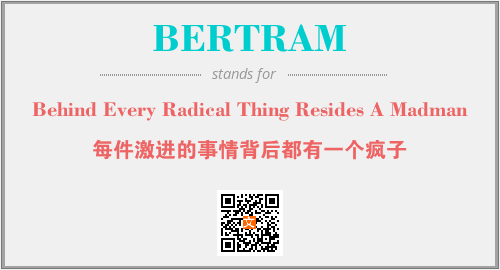 上述内容是“Behind Every Radical Thing Resides A Madman”作为“BERTRAM”的缩写,解释为“每件激进的事情背后都有一个疯子”时的信息,以及英文缩略词BERTRAM所代表的英文单词,其对应的中文拼音、详细解释以及在英文中的流行度和相关分类、应用领域及应用示例等。