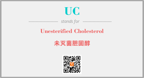 上述内容是“Unesterified Cholesterol”作为“UC”的缩写,解释为“未灭菌胆固醇”时的信息,以及英文缩略词UC所代表的英文单词,其对应的中文拼音、详细解释以及在英文中的流行度和相关分类、应用领域及应用示例等。