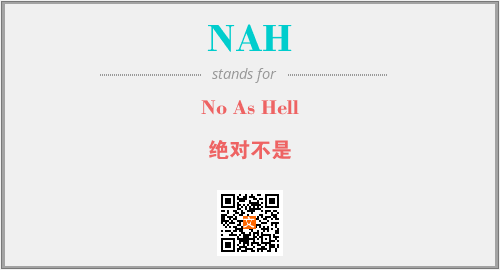 上述内容是“No As Hell”作为“NAH”的缩写,解释为“绝对不是”时的信息,以及英文缩略词NAH所代表的英文单词,其对应的中文拼音、详细解释以及在英文中的流行度和相关分类、应用领域及应用示例等。