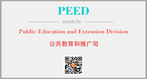 上述内容是“Public Education and Extension Division”作为“PEED”的缩写,解释为“公共教育和推广司”时的信息,以及英文缩略词PEED所代表的英文单词,其对应的中文拼音、详细解释以及在英文中的流行度和相关分类、应用领域及应用示例等。