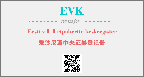英文缩略词“EVK”经常作为“Eesti väärtpaberite keskregister”的英文缩写来使用,中文表示:“爱沙尼亚中央证券登记册”。本文将详细介绍英文缩写词EVK所代表英文单词,其对应的中文拼音、详细解释以及在英语中的流行度。此外,还有关于缩略词EVK的分类、应用领域及相关应用示例等。