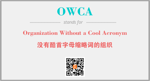 上述内容是“Organization Without a Cool Acronym”作为“OWCA”的缩写,解释为“没有酷首字母缩略词的组织”时的信息,以及英文缩略词OWCA所代表的英文单词,其对应的中文拼音、详细解释以及在英文中的流行度和相关分类、应用领域及应用示例等。
