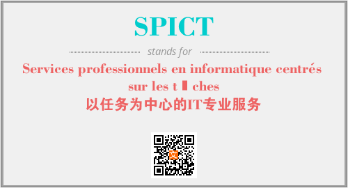 上述内容是“Services professionnels en informatique centrés sur les tâches”作为“SPICT”的缩写,解释为“以任务为中心的IT专业服务”时的信息,以及英文缩略词SPICT所代表的英文单词,其对应的中文拼音、详细解释以及在英文中的流行度和相关分类、应用领域及应用示例等。