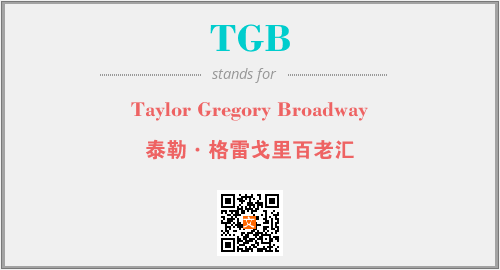 上述内容是“Taylor Gregory Broadway”作为“TGB”的缩写,解释为“泰勒·格雷戈里百老汇”时的信息,以及英文缩略词TGB所代表的英文单词,其对应的中文拼音、详细解释以及在英文中的流行度和相关分类、应用领域及应用示例等。