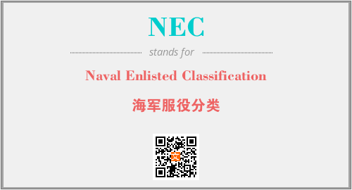 上述内容是“Naval Enlisted Classification”作为“NEC”的缩写,解释为“海军服役分类”时的信息,以及英文缩略词NEC所代表的英文单词,其对应的中文拼音、详细解释以及在英文中的流行度和相关分类、应用领域及应用示例等。
