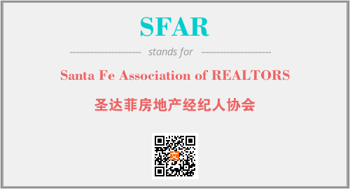 上述内容是“Santa Fe Association of REALTORS”作为“SFAR”的缩写,解释为“圣达菲房地产经纪人协会”时的信息,以及英文缩略词SFAR所代表的英文单词,其对应的中文拼音、详细解释以及在英文中的流行度和相关分类、应用领域及应用示例等。