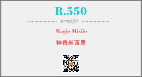 上述内容是“Magic Misile”作为“R.550”的缩写,解释为“神奇米西里”时的信息,以及英文缩略词R.550所代表的英文单词,其对应的中文拼音、详细解释以及在英文中的流行度和相关分类、应用领域及应用示例等。
