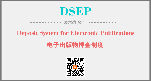上述内容是“Deposit System for Electronic Publications”作为“DSEP”的缩写,解释为“电子出版物押金制度”时的信息,以及英文缩略词DSEP所代表的英文单词,其对应的中文拼音、详细解释以及在英文中的流行度和相关分类、应用领域及应用示例等。