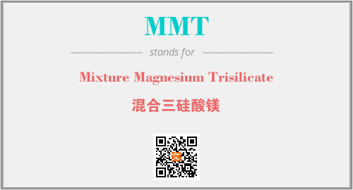 上述内容是“Mixture Magnesium Trisilicate”作为“MMT”的缩写,解释为“混合三硅酸镁”时的信息,以及英文缩略词MMT所代表的英文单词,其对应的中文拼音、详细解释以及在英文中的流行度和相关分类、应用领域及应用示例等。