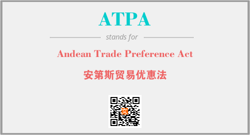 英文缩略词“ATPA”经常作为“Andean Trade Preference Act”的英文缩写来使用,中文表示:“安第斯贸易优惠法”。本文将详细介绍英文缩写词ATPA所代表英文单词,其对应的中文拼音、详细解释以及在英语中的流行度。此外,还有关于缩略词ATPA的分类、应用领域及相关应用示例等。