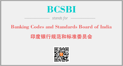 英文缩略词“BCSBI”经常作为“Banking Codes and Standards Board of India”的英文缩写来使用,中文表示:“印度银行规范和标准委员会”。本文将详细介绍英文缩写词BCSBI所代表英文单词,其对应的中文拼音、详细解释以及在英语中的流行度。此外,还有关于缩略词BCSBI的分类、应用领域及相关应用示例等。