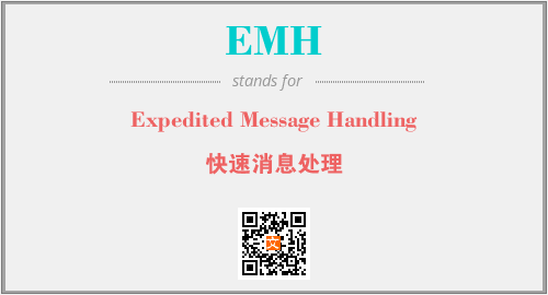 英文缩略词“EMH”经常作为“Expedited Message Handling”的英文缩写来使用,中文表示:“快速消息处理”。本文将详细介绍英文缩写词EMH所代表英文单词,其对应的中文拼音、详细解释以及在英语中的流行度。此外,还有关于缩略词EMH的分类、应用领域及相关应用示例等。