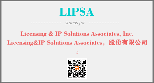 上述内容是“Licensing & IP Solutions Associates, Inc.”作为“LIPSA”的缩写,解释为“Licensing&IP Solutions Associates,股份有限公司。”时的信息,以及英文缩略词LIPSA所代表的英文单词,其对应的中文拼音、详细解释以及在英文中的流行度和相关分类、应用领域及应用示例等。