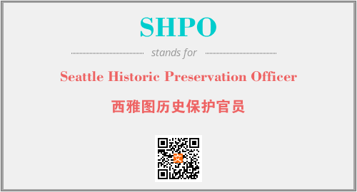 上述内容是“Seattle Historic Preservation Officer”作为“SHPO”的缩写,解释为“西雅图历史保护官员”时的信息,以及英文缩略词SHPO所代表的英文单词,其对应的中文拼音、详细解释以及在英文中的流行度和相关分类、应用领域及应用示例等。