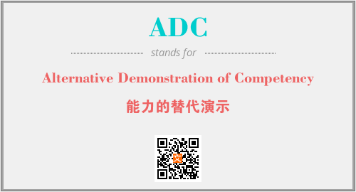 上述内容是“Alternative Demonstration of Competency”作为“ADC”的缩写,解释为“能力的替代演示”时的信息,以及英文缩略词ADC所代表的英文单词,其对应的中文拼音、详细解释以及在英文中的流行度和相关分类、应用领域及应用示例等。