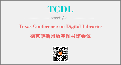 英文缩略词“TCDL”经常作为“Texas Conference on Digital Libraries”的英文缩写来使用,中文表示:“德克萨斯州数字图书馆会议”。本文将详细介绍英文缩写词TCDL所代表英文单词,其对应的中文拼音、详细解释以及在英语中的流行度。此外,还有关于缩略词TCDL的分类、应用领域及相关应用示例等。