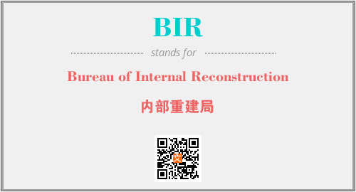 英文缩略词“BIR”经常作为“Bureau of Internal Reconstruction”的英文缩写来使用,中文表示:“内部重建局”。本文将详细介绍英文缩写词BIR所代表英文单词,其对应的中文拼音、详细解释以及在英语中的流行度。此外,还有关于缩略词BIR的分类、应用领域及相关应用示例等。