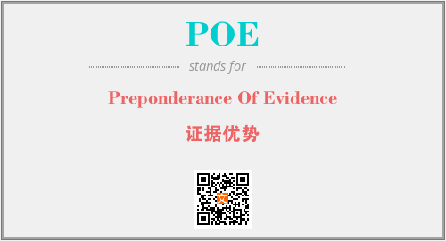 上述内容是“Preponderance Of Evidence”作为“POE”的缩写,解释为“证据优势”时的信息,以及英文缩略词POE所代表的英文单词,其对应的中文拼音、详细解释以及在英文中的流行度和相关分类、应用领域及应用示例等。