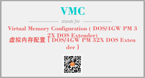 英文缩略词“VMC”经常作为“Virtual Memory Configuration ( DOS/4GW PM 32X DOS Extender)”的英文缩写来使用,中文表示:“虚拟内存配置(DOS/4GW PM 32X DOS Extender)”。本文将详细介绍英文缩写词VMC所代表英文单词,其对应的中文拼音、详细解释以及在英语中的流行度。此外,还有关于缩略词VMC的分类、应用领域及相关应用示例等。