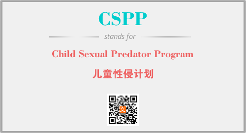 上述内容是“Child Sexual Predator Program”作为“CSPP”的缩写,解释为“儿童性侵计划”时的信息,以及英文缩略词CSPP所代表的英文单词,其对应的中文拼音、详细解释以及在英文中的流行度和相关分类、应用领域及应用示例等。