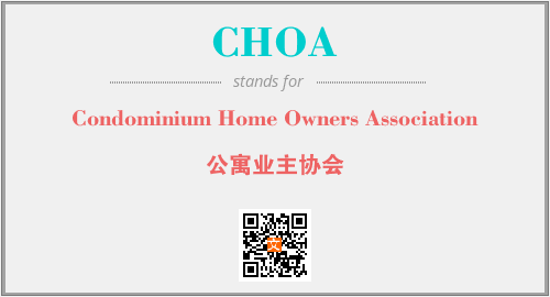 上述内容是“Condominium Home Owners Association”作为“CHOA”的缩写,解释为“公寓业主协会”时的信息,以及英文缩略词CHOA所代表的英文单词,其对应的中文拼音、详细解释以及在英文中的流行度和相关分类、应用领域及应用示例等。